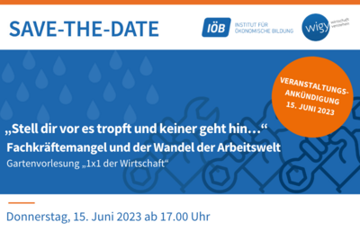 Das Institut für Ökonomische Bildung (IÖB) und die Wirtschaftsbildungsinitiative wigy e. V. laden zur Gartenvorlesung „1x1 der Wirtschaft“ ein, die in diesem Jahr am Donnerstag, den 15.06.2023, um 17.00 Uhr stattfindet. In besonderer Atmosphäre im Zelt im Institutsgarten des IÖB sind immer wieder aktuelle und relevante Themen auf dem Programm: Unter dem Titel „Stell dir vor es tropft und keiner geht hin…“ stehen in diesem Jahr der Fachkräftemangel und der Wandel der Arbeitswelt im Fokus der Veranstaltung.
